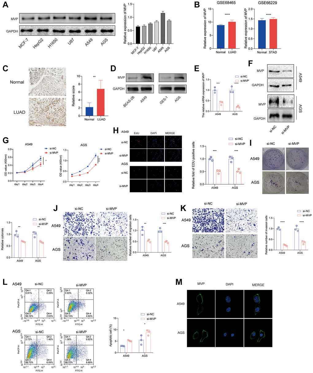 In order to investigate the functional role of MVP in cancers, we assessed the protein expression levels of MVP in various tumor cells. The results revealed the highest expression level in A549 and AGS (Figure 8A). Furthermore, the GEO database showed that MVP was highly expressed in LUAD and STAD compared with adjacent tissues (Figure 8B). Immunohistochemical data showed the same results in lung cancer (Figure 8C). Western blot assay confirmed that MVP expression was higher in A549 and AGS cells than in their corresponding normal epithelial cells (Figure 8D). Consequently, we conducted in vitro experiments utilizing A549 and AGS cells. Initially, we confirmed the efficacy of siRNAs targeting MVP through RT-qPCR and western blot analysis, which demonstrated a significant reduction in MVP expression in A549 and AGS cells compared to the control group (Figure 8E, 8F). Knocking down MVP inhibited cell proliferation, as shown in CCK-8 and EdU assays (Figure 8G, 8H). MVP knockdown also reduced colony formation, indicating its role in promoting cancer cell growth (Figure 8I). Additionally, MVP knockdown decreased cell migration and invasion, suggesting its involvement in these processes (Figure 8J, 8K). Furthermore, MVP knockdown promote apoptosis (Figure 8L). Immunofluorescence assay showed that MVP was mainly distributed in the cell membrane and cytoplasm of A549 and AGS cells, but not in the nucleus (Figure 8M). Overall, our results demonstrate that MVP acts as a tumor promoter in cancers by enhancing cell proliferation, migration, invasion and attenuated apoptosis.