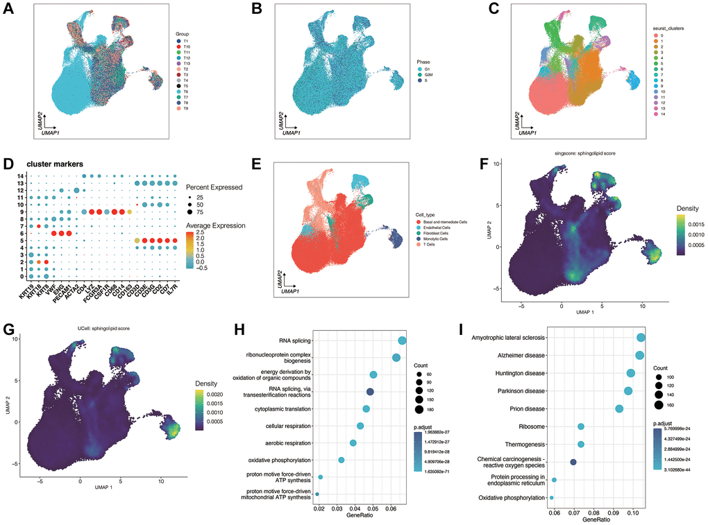 Initially, our investigation centered on sphingolipid metabolism enrichment at the single-cell level. In Figure 1A, 1B, it is evident that following quality control and sample integration, we retained 11 tumor samples, and there was no noticeable batch effect among them. The clustering of tumor samples into 15 distinct clusters is demonstrated in Figure 1C–1E. We categorized these clusters into 5 cell types based on the expression of cell type marker genes from previously published research. These cell types include Basal and Intermediate Cells, Endothelial Cells, Fibroblast Cells, Monocytic Cells, and T Cells.