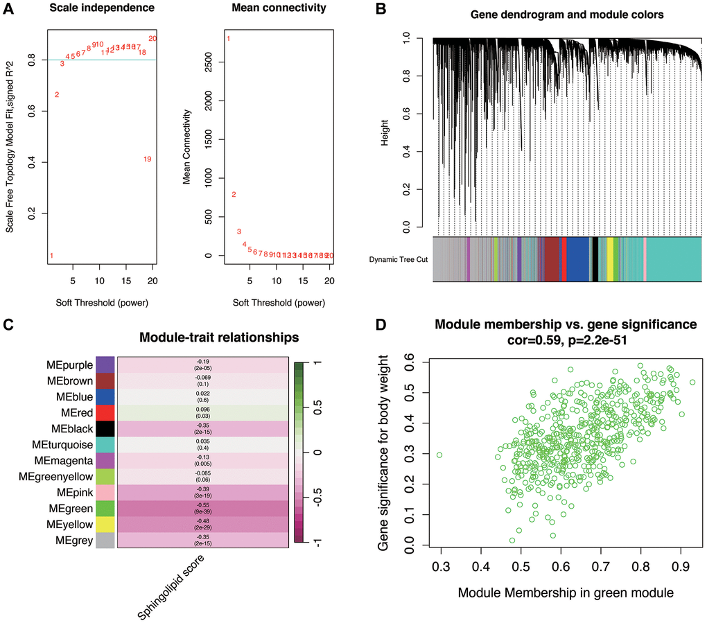 In Figure 2B, 2C, the genes were grouped into 11 non-gray modules, with the green module demonstrating the highest correlation with the sphingolipid metabolism phenotype (correlation = −0.55 and p < 0.05). A closer look at the inter-gene correlations within the green module is presented in Figure 2D. Module membership within the green module was found to be positively correlated with Gene significance for body weight (correlation = 0.59 and p < 0.05).