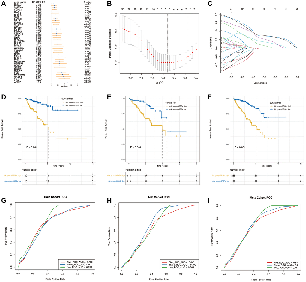 Figure 3D–3F illustrate that in the training cohort, validation cohort, and the entire meta cohort, patients in the SRSRs_high group exhibited poorer prognosis and shorter disease-free survival. Prognostic ROC analysis, as depicted in Figure 3G–3I, indicated that the model demonstrated good accuracy in assessing patient prognosis at 1, 3, and 5 years.