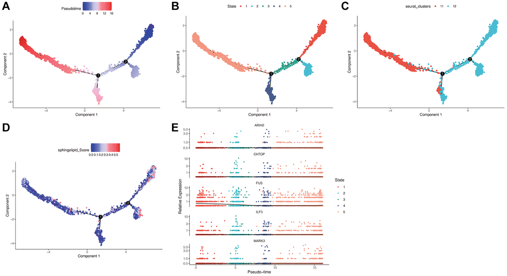In Figure 5A–5D, the color scale indicates the differentiation stages, with darker blue representing early cell differentiation and darker red indicating late differentiation. There are five cell differentiation states in total, with cluster 12 primarily in differentiation states 1, 2, and 3, while cluster 11 primarily occupies state 1, and state 4 contains both cluster 11 and cluster 12. Additionally, we observed that Fibroblast Cells with high sphingolipid enrichment scores exhibited more advanced differentiation.