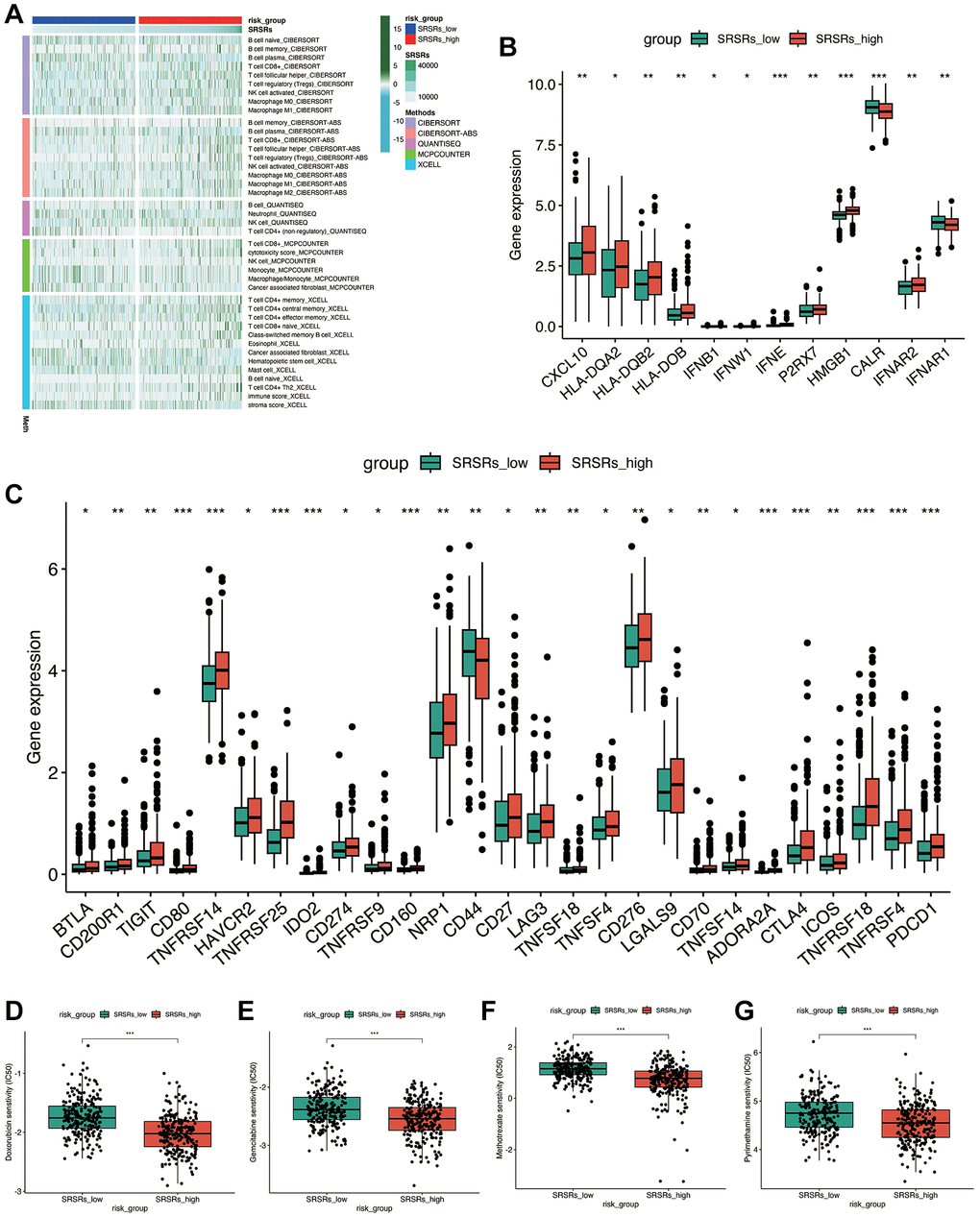 We proceeded to investigate the disparities in immune cell infiltration between the two groups defined by the model. As depicted in Figure 6A, the SRSRs_high group exhibited a higher level of immune infiltration by T cells and NK cells. In Figure 6B, 6C, it was observed that most leukocyte antigen genes, immune checkpoint genes, and tumor necrosis genes were highly expressed in the SRSRs_high group, including genes like BTLA, CD80, PDCD1, CXCL10, and HLA-DQA2. However, some genes such as CD44 and CALR were underexpressed in the SRSRs_high group.
