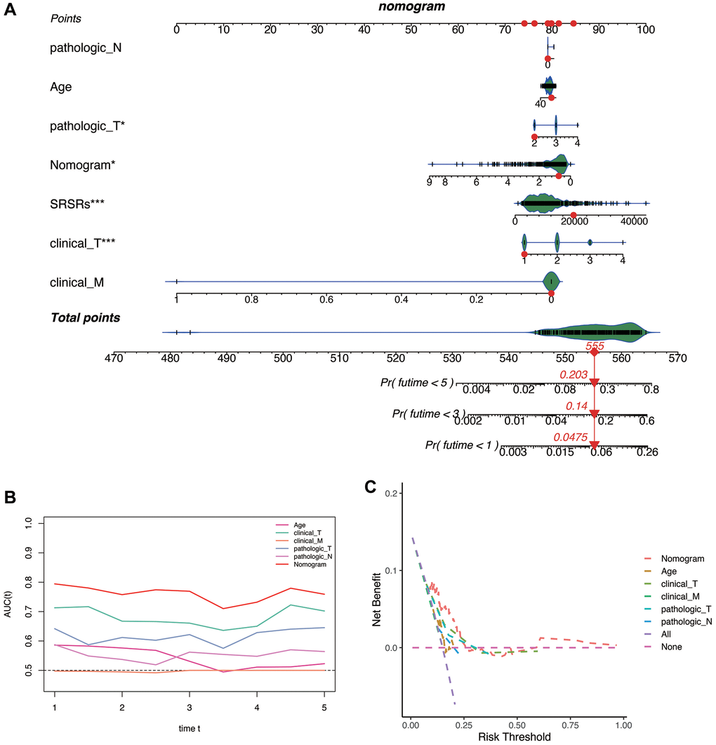 To enhance the prediction of patient prognosis, we developed a nomogram. Figure 7A provides the 1, 3, and 5-year recurrence or mortality rates for patients in the TCGA database, which were 0.0475, 0.14, and 0.203, respectively. Figure 7B, 7C illustrate that the prognostic ROC curve analysis demonstrated the effectiveness of the nomogram in predicting patient prognosis, with an AUC consistently around 0.8. This performance surpassed that of other clinical indicators. Moreover, using the nomogram for clinical decision-making would be most advantageous for patients.