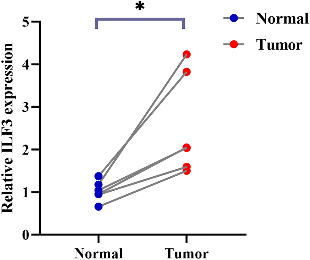 Five patients with prostate cancer were enrolled between January 2022 and December 2022, all of whom were diagnosed with prostate cancer by prostate biopsy before surgery. After admission, they underwent surgery to remove prostate cancer. The tumor tissue was divided into an experimental group, and the adjacent normal tissue was used as normal control group. The expression level of ILF3 was detected by PCR. The study was approved by the Ethics Committee of The Affiliated Huaian No. 1 People’s Hospital of Nanjing Medical University. Tissue-derived total RNA was extracted and utilized to synthesize complementary DNA (cDNA) following the manufacturer’s instructions provided in the PrimeScript™ RT reagent kit with gDNA Eraser (TaKaRa, Kusatsu, Japan). Quantitative reverse transcription-polymerase chain reaction (qRT-PCR) was conducted using the AceQ Universal SYBR qPCR Master Mix (Vazyme, Nanjing, China) on a QuantStudio 7 PCR system (Thermo Fisher Scientific, CA, USA). The primer set employed in this study is detailed below: