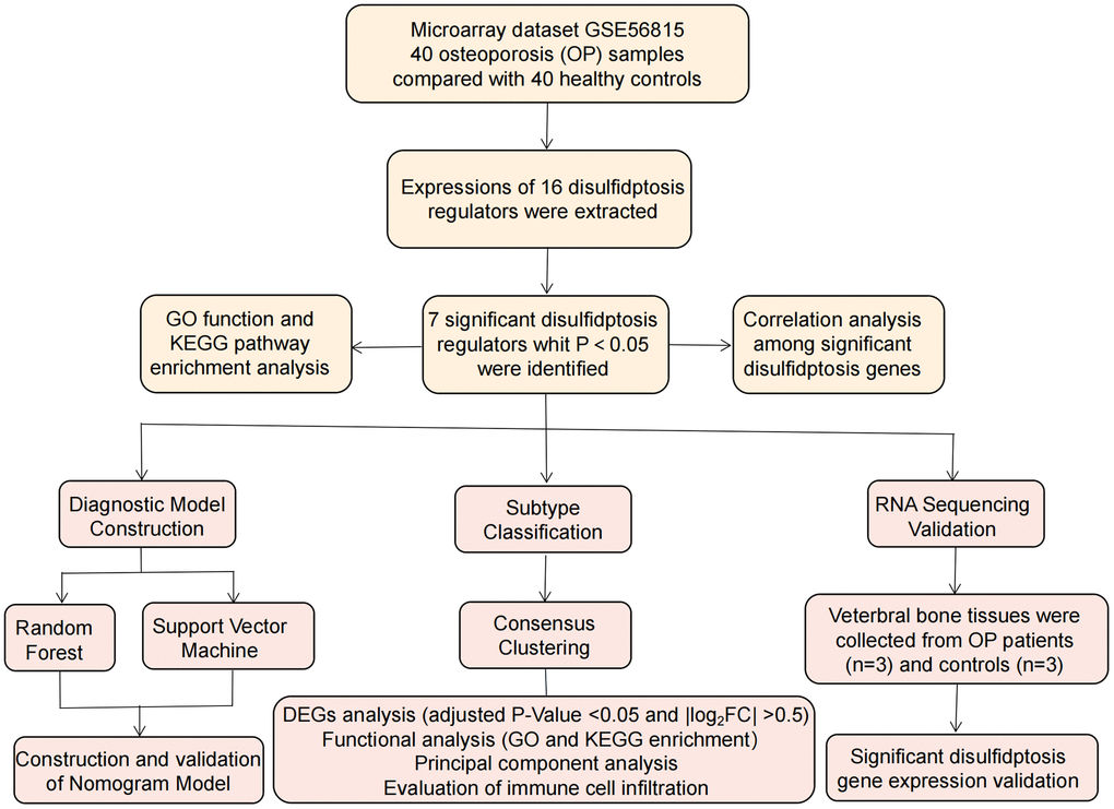 Utilizing the GSE56815 dataset [15], we investigated the relevance of disulfidptosis regulators in delineating OP subtypes and identifying potential diagnostic biomarkers. A predictive model for OP susceptibility was devised, integrating seven putative disulfidptosis regulators (FLNA, ACTB, PRDX1, SLC7A11, NUBPL, OXSM, and RAC1), demonstrating utility in clinical practice. Validation of these disulfidptosis regulators was conducted via RNA sequencing (RNA-seq), confirming expression patterns consistent with bioinformatics predictions. Furthermore, our analysis unveiled two distinct disulfidptosis patterns, exhibiting significant associations with many immune cells like monocytes. These findings underscore the potential of disulfidptosis patterns as diagnostic markers for OP, offering insights into tailored immunotherapeutic interventions. Methodological approaches employed in this study align with previous published literature [16–18]. The flow chart of research process is described in Figure 1.
