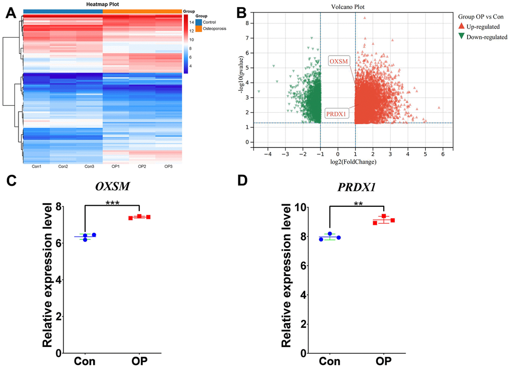 The RNA-seq analysis revealed significantly increased expression levels of the disulfidptosis genes OXSM and PRDX1 in OP patients in comparison to controls (Figure 10). These findings validate the involvement of these disulfidptosis modulators in OP and bring insights on their role in OP etiology, offering support for the hypothesis that disulfidptosis regulators play a vital role in OP progression. These disulfidptosis modulators may represent promising therapeutic targets for efforts to balance bone formation and resorption in OP. To date, this study firstly establishes a diagnostic cluster and an immunological landscape associated with disulfidptosis in OP. However, the in-depth mechanisms by which disulfidptosis regulators influence OP-related pathways and immune microenvironment require further experimental validation.