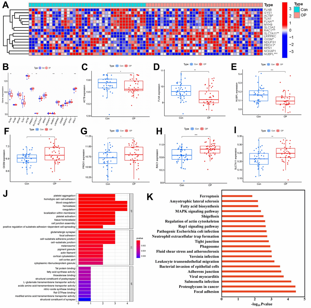 In total, 16 regulators associated with disulfidptosis were identified by analyzing gene expression profiles from both control and OP cases. From this analysis, seven distinct regulators (FLNA, ACTB, PRDX1, SLC7A11, NUBPL, OXSM, and RAC1) emerged, depicted in a heat map and box plot (Figure 2A, 2B). Notably, ACTB, FLNA, and NUBPL showed reduced expression levels, while PRDX1, SLC7A11, OXSM, and RAC1 exhibited increased expression in OP cases compared to controls (Figure 2C–2I). Additionally, GO analysis highlighted significant enrichment in biological process (tissue homeostasis), cellular components (glutamatergic synapses and actin filaments), and molecular function (L-glutamate transmembrane transporter activity) (Figure 2J). Furthermore, regulation of actin cytoskeleton and ferroptosis pathways emerged as the main enriched pathways according to KEGG analysis (Figure 2K). Detailed information regarding the GO and KEGG enrichment analyses can be found in Supplementary Tables 1, 2.
