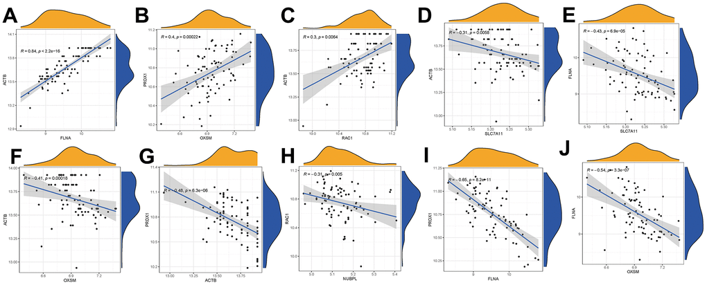 In OP samples, there were significantly positive associations observed in the gene expressions of ACTB–FLNA, ACTB–RAC1, and PRDX1–OXSM (Figure 3A–3C). Conversely, significantly negative correlations were noted in the gene expressions of ACTB–SLC7A11, FLNA–SLC7A11, ACTB–OXSM, PRDX1–ACTB, RAC1–NUBPL, PRDX1–FLNA, and FLNA–OXSM (Figure 3D–3J). These observations underscore distinct correlations among various disulfidptosis modulators in OP.