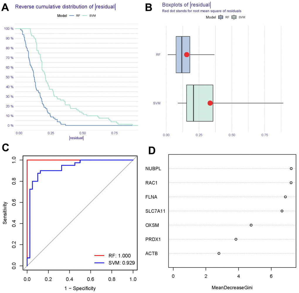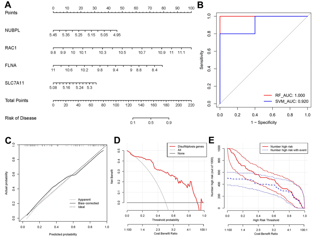 In this study, we utilized RF and SVM models to create a gene signature associated with disulfidptosis, employing the seven significant disulfidptosis regulators. The RF model operates as a learning algorithm by assembling independent decision trees derived from random samples. Each decision tree undergoes independent learning and prediction, with the final result being the average of all trees [27, 28]. On the other hand, the SVM model acts as a discriminative classifier, trained on labelled samples to classify test samples using the output of an optimal hyperplane [29]. In comparison to the SVM model, we observed that the RF model had higher AUC value and smaller residual, making it the most suitable testing model. Subsequently, the established RF model predicted the occurrence of OP, highlighting seven significant disulfidptosis regulators with differential expression between OP and control samples (namely, SLC7A11, FLNA, ACTB, PRDX1, NUBPL, OXSM, and RAC1) as potential diagnostic markers. Furthermore, we developed a nomogram model consisting of four potential disulfidptosis regulators (SLC7A11, FLNA, NUBPL, and RAC1) with significance scores > 6, based on DCA analysis of clinical benefits for OP patients.