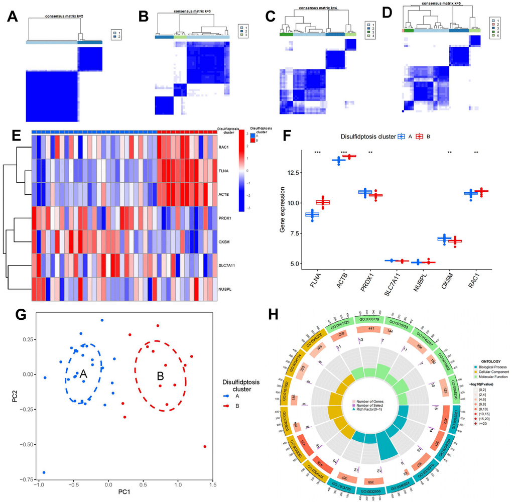 Through the utilization of ConsensusClusterPlus, we identified two distinct disulfidptosis clusters, denoted as clusters A and B, according to the expression profiles of the seven disulfidptosis regulators (Figure 6A–6D). Notably, cluster A encompassed 27 samples, while cluster B comprised 13 samples. Differential analysis of the gene expressions in the seven disulfidptosis modulators between these clusters revealed clear distinctions as depicted on heat maps and box plots. Specifically, cluster B demonstrated higher expression levels of FLNA, ACTB, and RAC1, whereas cluster A exhibited elevated expression levels of PRDX1 and OXSM. However, no significant differences were observed in the gene expressions of SLC7A11 and NUBPL between the two clusters (Figure 6E, 6F). PCA corroborated the discriminatory power of the seven disulfidptosis regulators in distinguishing between the two disulfidptosis clusters (Figure 6G). Subsequently, we identified 127 DEGs associated with disulfidptosis between the two clusters. To elucidate the functional roles of these DEGs in OP, we conducted GO enrichment analysis (Figure 6H), revealing enrichment terms such as regulation of actin cytoskeleton organization (GO: 0032956), regulation of actin filament-based process (GO: 0032970), cell-substrate junction (GO: 0030055), and actin binding (GO:0003779). The information containing the GO enrichment results was available in Supplementary Table 3.