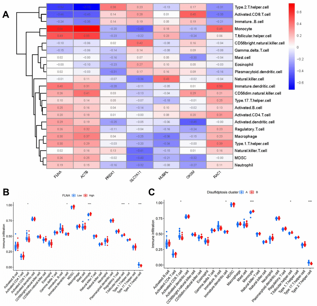 Positive associations were noted among FLNA expression and several immune cell subsets (Figure 7A). Next, differences in immune cell infiltration were further explored between patients with high and low expression levels of FLNA. Remarkably, individuals with high FLNA expression displayed heightened immune cell infiltration in comparison to those with low FLNA expression (Figure 7B). Cluster B emerged to be more strongly correlated with OP, given its association with immature dendritic cells, monocytes, and T follicular helper cells, which are closely involved in osteoclast differentiation. Conversely, cluster A was associated with activated CD8+ T cells and type 2 T helper cells (Figure 7C).