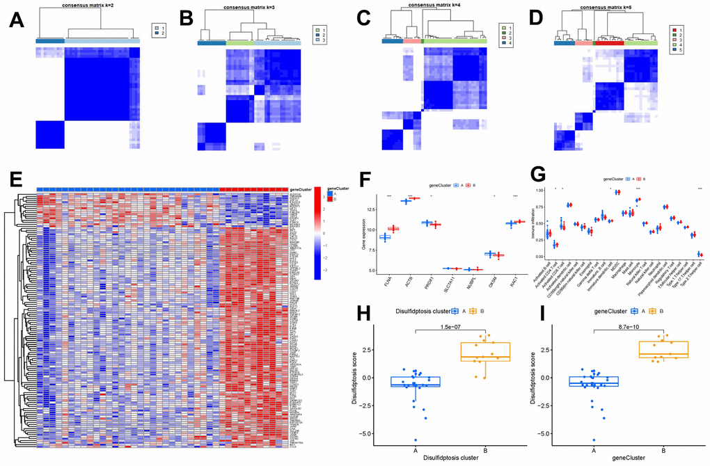To delineate disulfidptosis patterns, we employed a consensus clustering technique to categorize OP samples into distinct genetic subtypes according to 127 disulfidptosis-associated DEGs. The analysis unveiled two distinct disulfidptosis gene clusters, denoted as gene clusters A and B, which aligned with the disulfidptosis clusters previously identified (Figure 8A–8D). Expression profiles of the 127 disulfidptosis-related DEGs in gene clusters A and B are described in Figure 8E. Furthermore, the levels of immune cell infiltration and the gene expressions of the seven vital disulfidptosis regulators in gene clusters A and B were also similar to the disulfidptosis patterns (Figure 8F, 8G), validating the precision of the consensus clustering method. Notably, cluster B and gene cluster B showed higher disulfidptosis scores in comparison to cluster A and gene cluster A (Figure 8H, 8I).