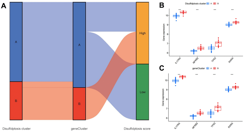 The associations among disulfidptosis patterns, disulfidptosis scores, and disulfidptosis gene patterns are presented in Figure 9A. To explore the associations between OP and disulfidptosis patterns, we investigated correlations among disulfidptosis patterns and the expression levels of IL17RA, NFKB2, TP53, and RXRA, which are closely linked to osteoclast differentiation. Notably, higher expression levels of IL17RA, NFKB2, TP53, and RXRA were noted in cluster B and gene cluster B compared to cluster A and gene cluster A, suggesting a strong association of cluster B and gene cluster B with OP characterized by osteoclast differentiation (Figure 9B, 9C).