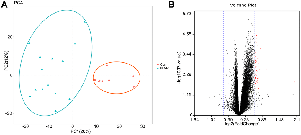 The GSE74144 dataset was obtained from the GEO database. After performing PCA, the repeatability of data in the GSE74144 dataset was shown to be acceptable. The distances between samples in both the control group and the HLVR group were close in the dimension of PC1 (Figure 1A).