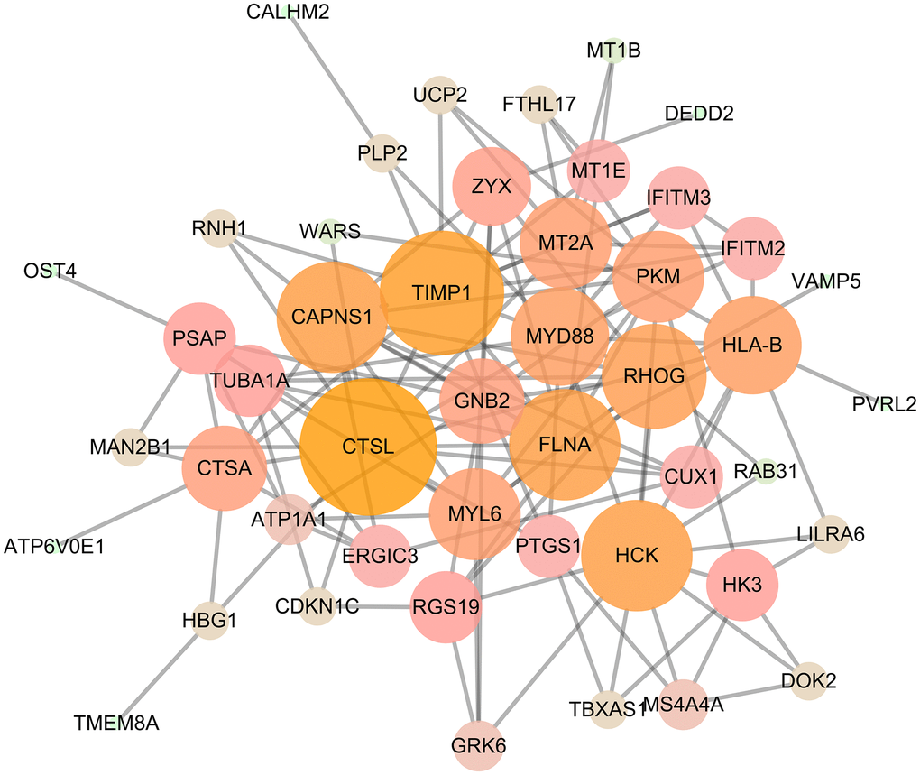 The three most significant modules were obtained from the PPI network using Cityscape. The first module consisted of MS4A4A, HCK, HK3, DOK2, RGS19, PKM, CAPNS1, and GNB2 (Figure 4A). The second module consisted of FLNA, RHOG, MYL6, and ZYX (Figure 4B).