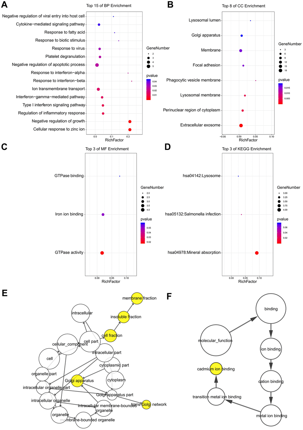 Following an analysis using DAVID, the results of our GO analysis showed that variations in DEGs linked with BP were mainly enriched in negative regulation of growth, regulation of inflammatory response, interferon-gamma-mediated pathway, response to interferon-alpha, and negative regulation of apoptotic processes (Figure 3A). Variations in DEGs linked with CC were significantly enriched in extracellular exosome, perinuclear region of cytoplasm, lysosomal membrane, phagocytic vesicle membrane, focal adhesion, and membrane (Figure 3B). With regard to MF, DEGs were significantly enriched in GTPase activity, iron ion binding, and GTPase binding (Figure 3C). Analysis of KEGG pathways indicated that the top canonical pathways associated with the DEGs were mineral absorption, Salmonella infection, and lysosome (Figure 3D).