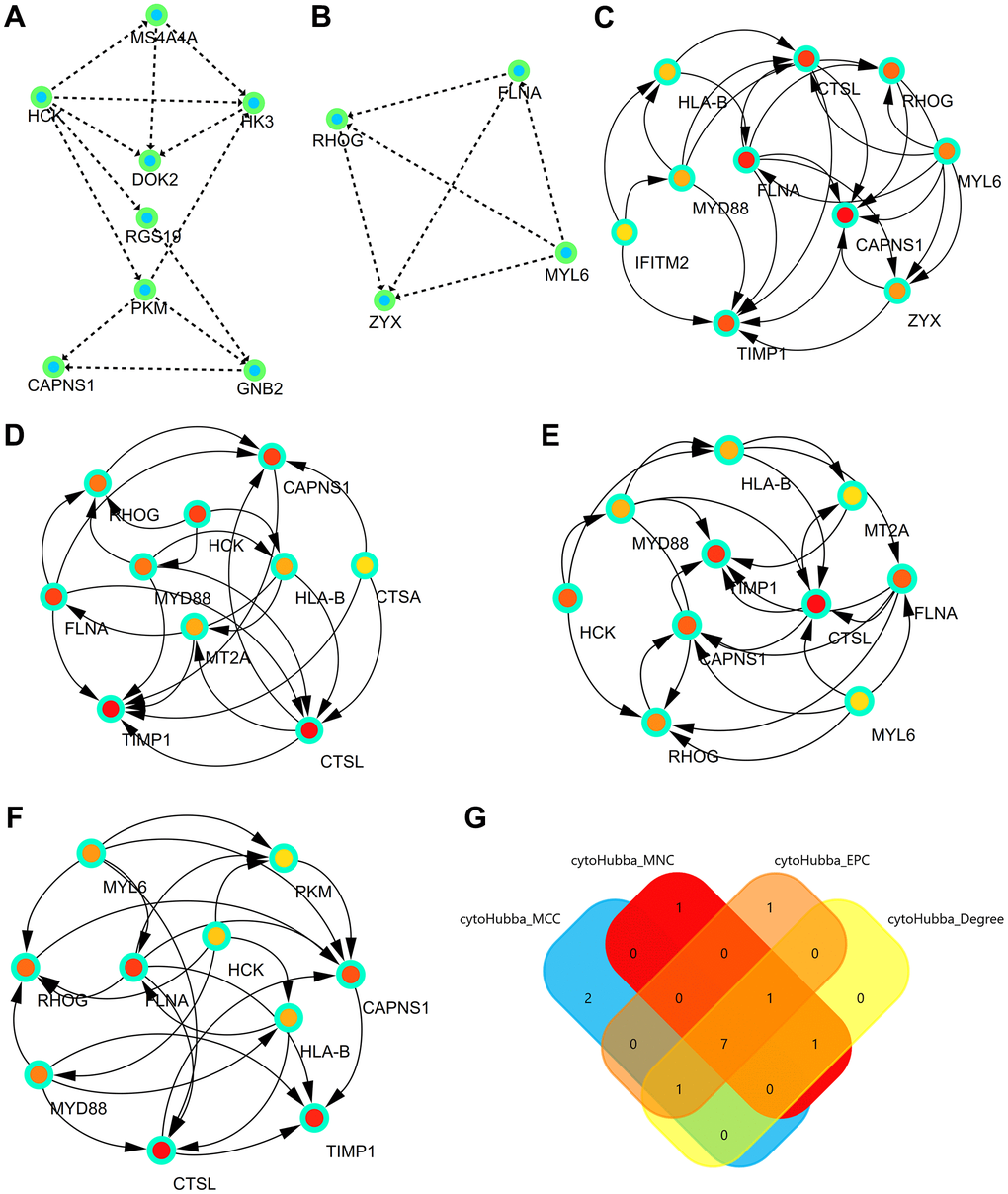 Hub genes were identified by four algorithms, presented in Figure 4C–4F. Finally, the significant hub genes (HLA-B, CTSL, RHOG, FLNA, MYD88, CAPNS1, and TIMP1) were identified using a Venn diagram (Figure 4G).