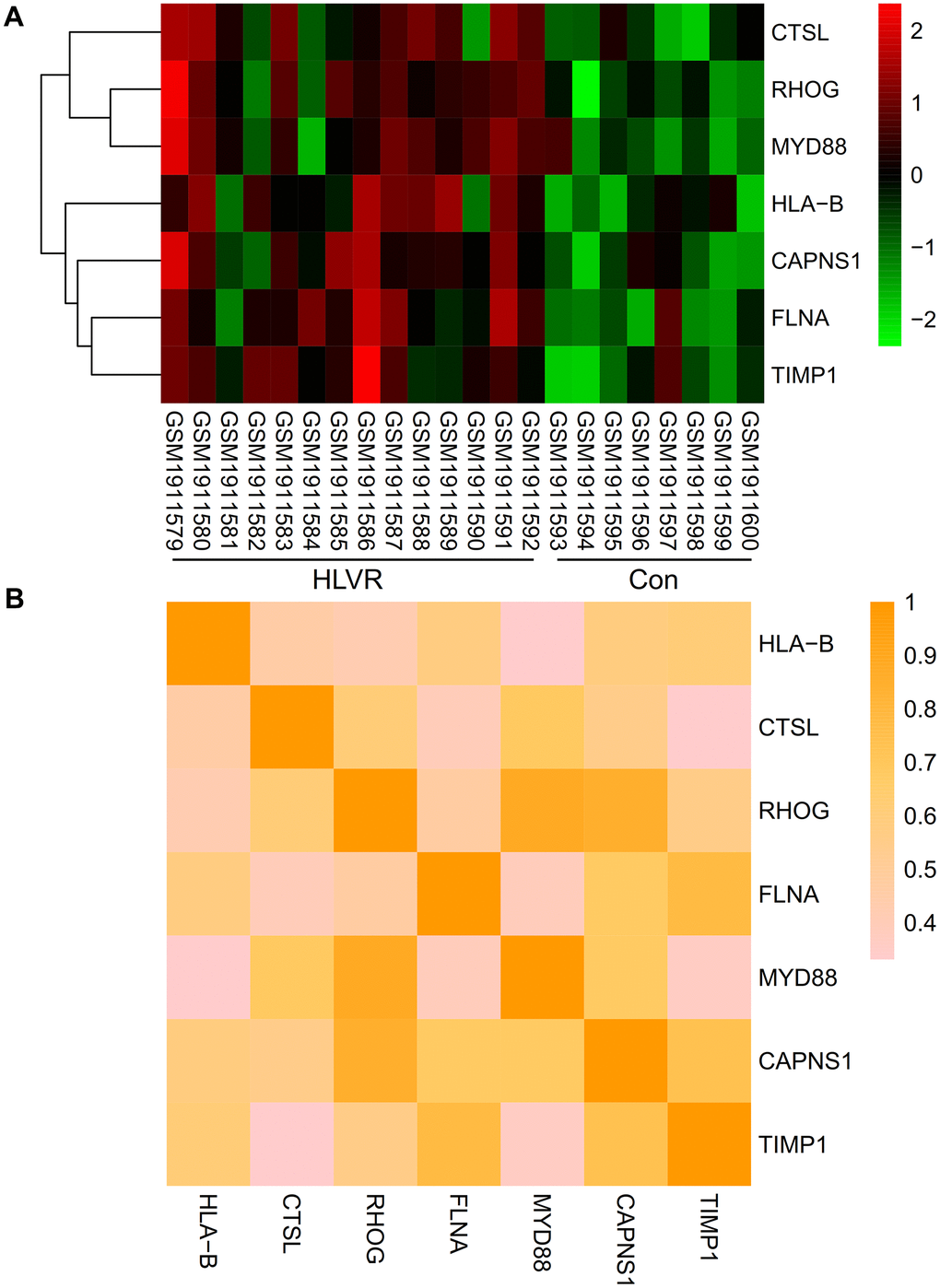 A heatmap was generated to show the expression levels of significant hub genes in the GSE74144 dataset. When compared with the control white blood cell samples, the expression of HLA-B, CTSL, RHOG, FLNA, MYD88, CAPNS1, and TIMP1 were up-regulated in the HLVR white blood cell samples (Figure 5A). The correlations among all significant hub genes are shown in Figure 5B.