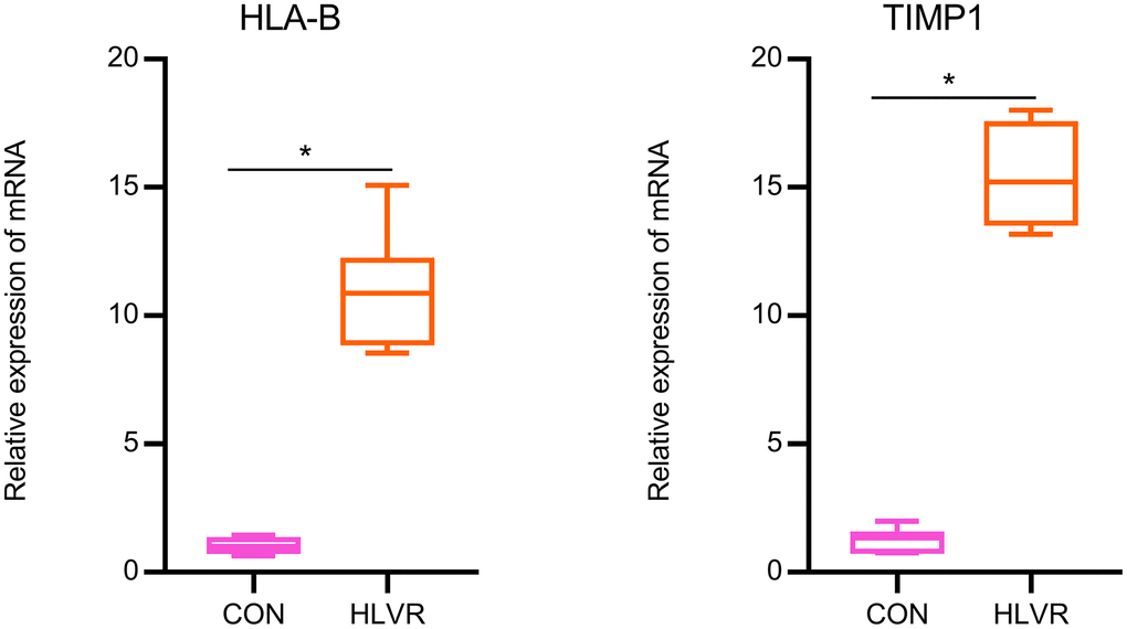 According to the above expression analysis, HLA-B and TIMP1 were significantly up-regulated in HLVR samples. As shown in Figure 7, the relative expression levels of HLA-B and TIMP1 were significantly higher in HLVR samples compared with the control groups. This result demonstrated that HLA-B and TIMP1 might be considered as biomarkers for HLVR (Figure 7).