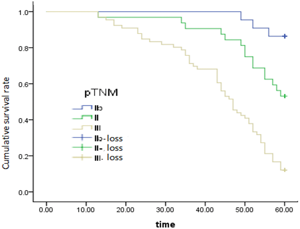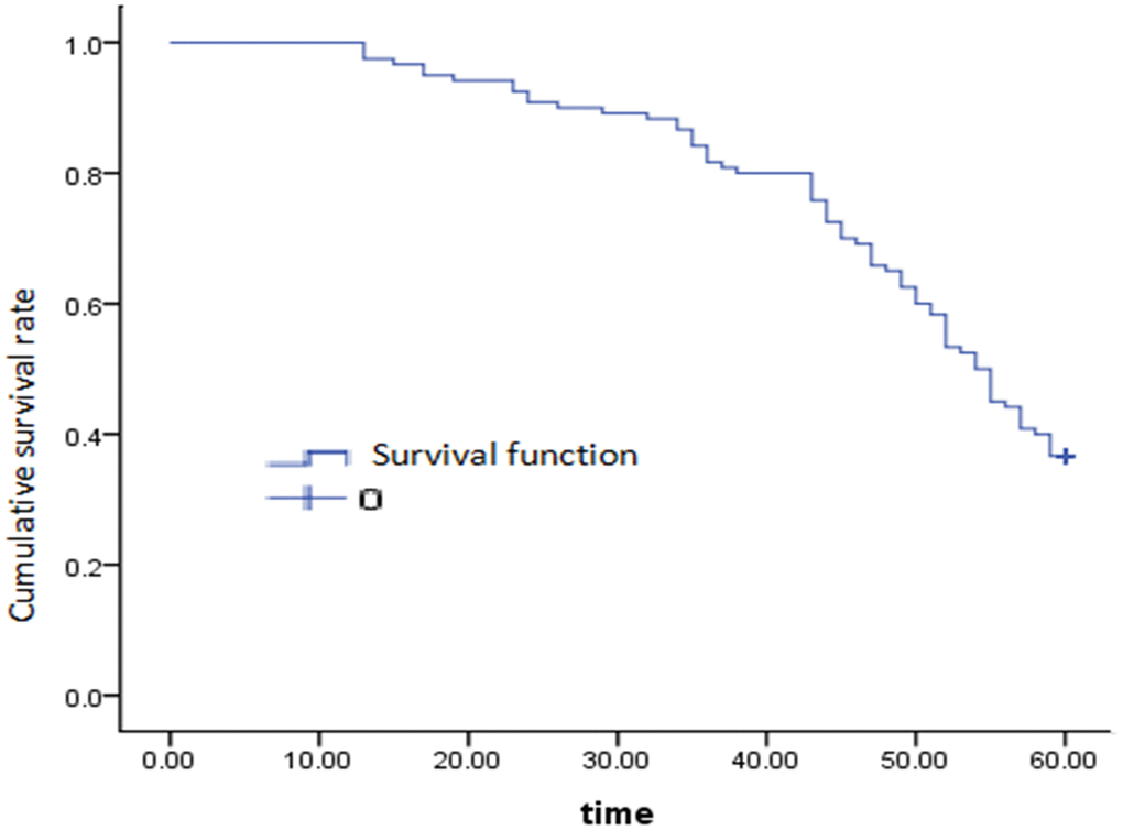 There were 5 cases of anastomotic leakage, 3 cases of postoperative anastomotic hemorrhage, 3 cases of pulmonary infection and 6 cases of incisional infection. All patients were cured and discharged. Patients were followed up for 0 to 60 months. Excluding the missing patients, the 5-year follow-up rate was 92.5%, the 5-year overall survival rate was 36.2% (Figure 1), and the median survival time was 53.0 ± 1.461 months.