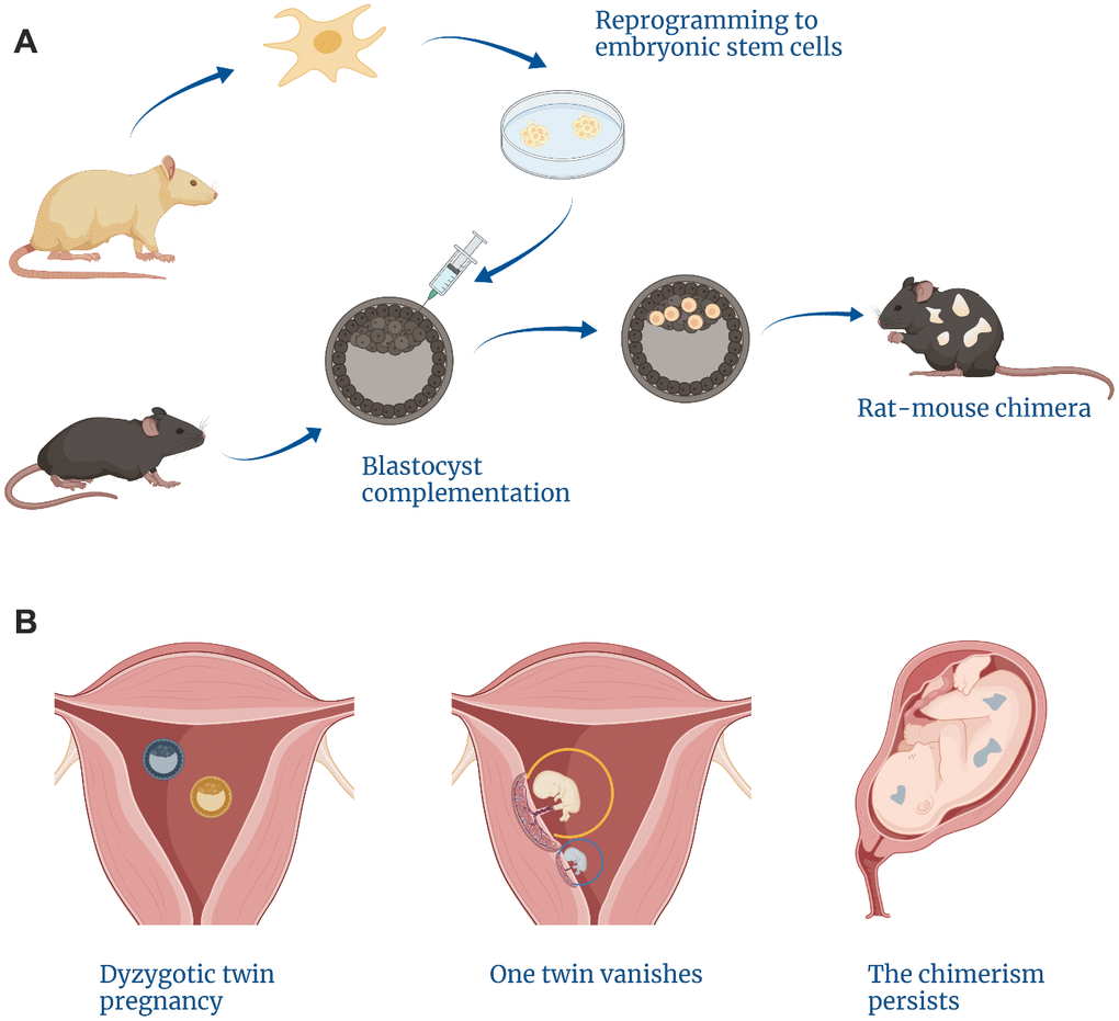 Moreover, chimeras can be created from early embryos belonging to different species. This can be illustrated by the reports of various non-primate mammalian chimeras such as rat-mouse chimeras that develop into viable animals (Figure 1A) [14]. Human embryonic stem cells also preserve the ability to survive within non-primate embryos (such as pig [15] or mouse [16]).