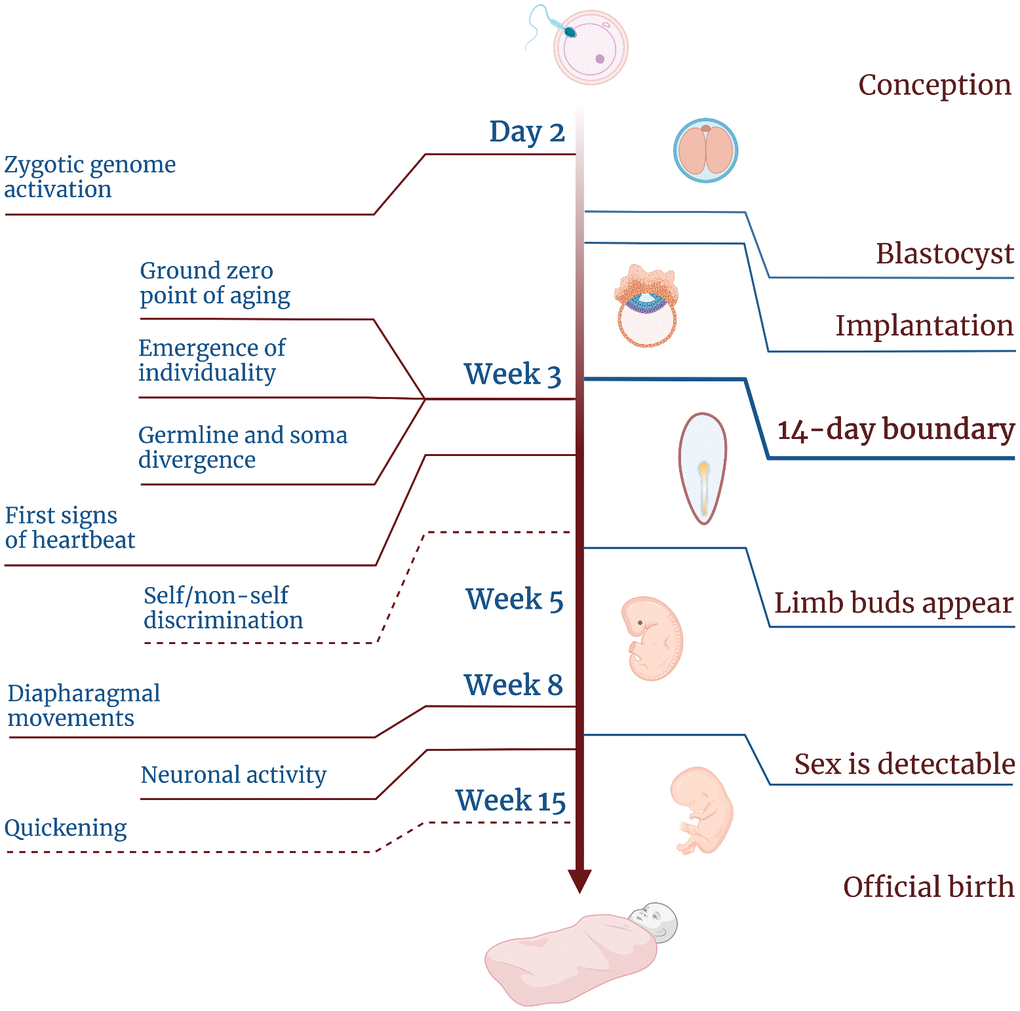 Thus, it is likely that the ground zero point of aging is grounded in evolution and conserved across vertebrates. In humans, it would fall on the third week after an egg meets a sperm—at or right after the boundary set by Mary Warnock and her colleagues in 1984 (Figure 4).