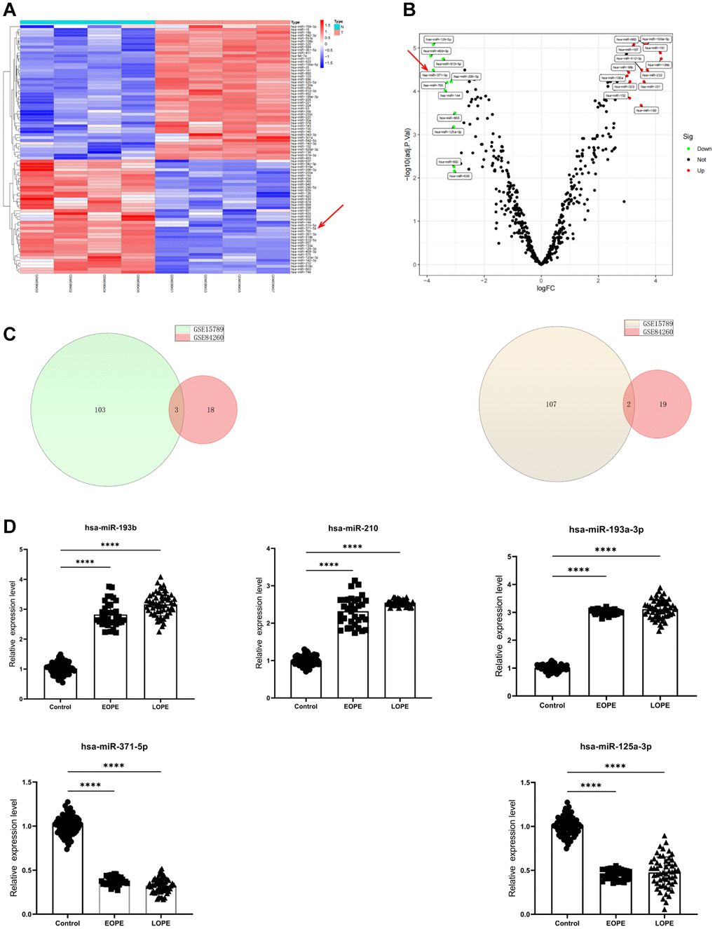 The microarray data GSE15789 demonstrated that 106 miRNAs exhibited a considerable increase in expression, while 109 miRNAs displayed a significant decrease in expression among individuals diagnosed with PE (Figure 1A, 1B). A comprehensive set of stringent screening criteria was used to identify 21 downregulated miRNAs and 21 upregulated miRNAs from the GSE84260 dataset. These miRNAs were then represented in a Venn diagram (Figure 1C). Three gene intersections exhibited upregulated expression, namely, hsa-miR-193b, hsa-miR-210-3p, and hsa-miR-193a-3p. Conversely, two gene intersections, specifically hsa-miR-371-5p and hsa-miR-125a-3p, were downregulated.
