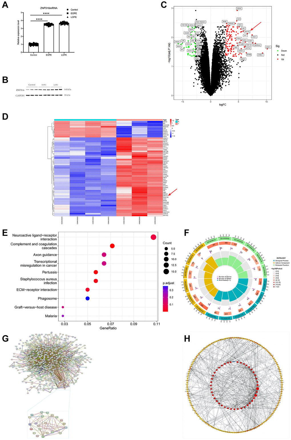 The study involved the collection of 89 placental samples from women diagnosed with PE, while 71 samples were taken from women with normal blood pressure. The RT-qPCR analysis results indicated that considerable upregulation of ZNF516 mRNA expression in placentas affected EOPE and LOPE (Figure 2A). Subsequently, Western blotting analysis confirmed an increase in the protein level of ZNF516 (Figure 2B). A total of 203 upregulated mRNAs were identified from the GSE96985 database. Conversely, 105 mRNAs were downregulated (Figure 2C, 2D). The present study confirmed that there is an upregulation of ZNF516 expression in patients who have been diagnosed with PE. To further investigate the potential impact of ZNF516 on the molecular biology of cells, an analysis was conducted first utilizing the Gene Ontology (GO) and then the Kyoto Encyclopedia of Genes and Genomes (KEGG) GSE96985 databases (Figure 2E, 2F). The analyses revealed disparities in genetic pathways, suggesting the participation of these genes in several biological processes, including connective tissue creation, cellular growth, and epithelial cell proliferation. Analysis of protein-protein interactions (PPI) validated the network and identified significant differentially expressed genes (DEGs). Among the six essential genes, ZNF516 (degree = 8), PRDM16 (degree = 12), RCOR1 (degree = 12), and CDH1 (degree = 61) were upregulated, and BICC1 (degree = 5) and KDM1A (degree = 16) were downregulated (Figure 2G, 2H).