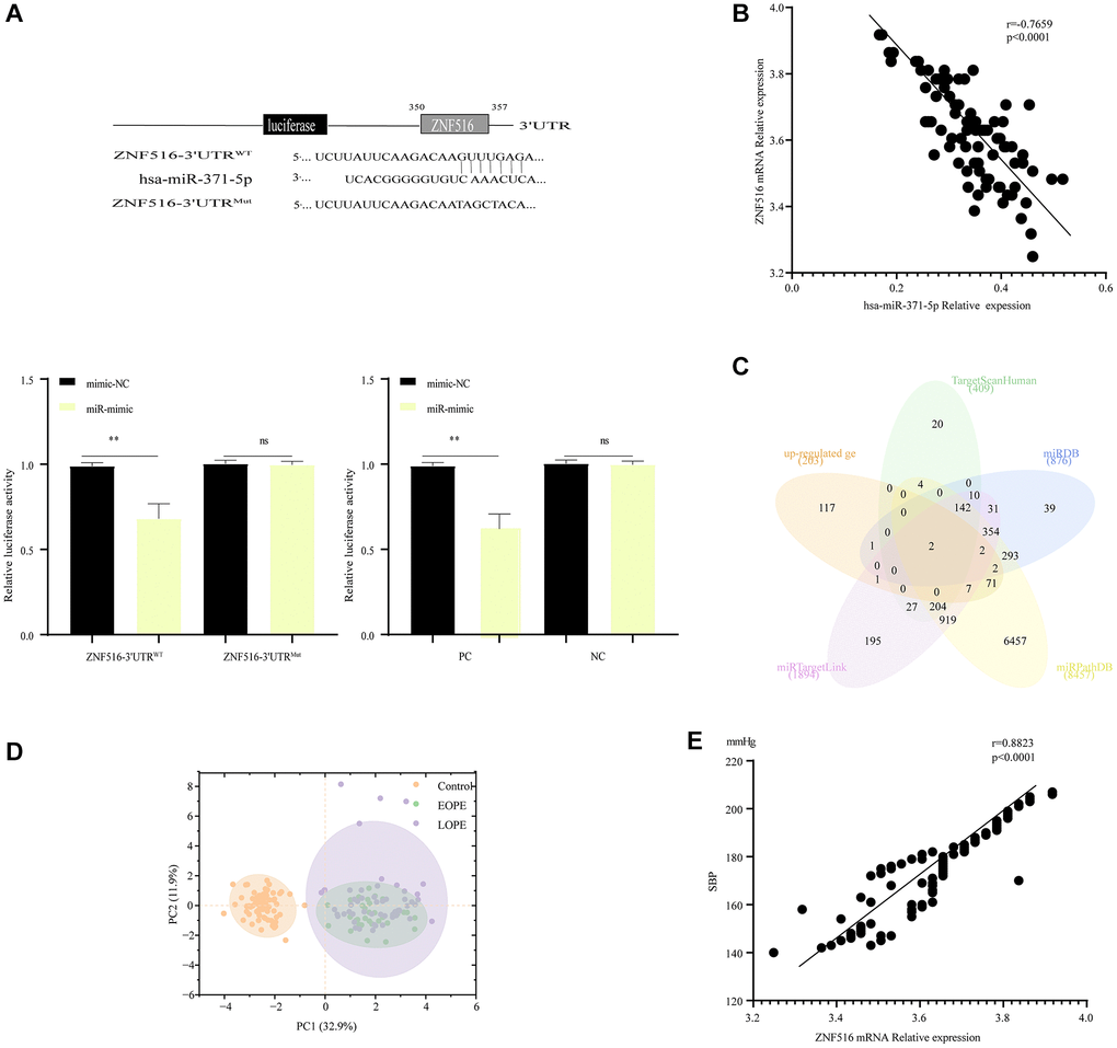 The sequence of hsa-miR-371-5p was identified in the 3′-UTR (untranslated region) of ZNF516 mRNA through the use of TargetScan (Supplementary Table 3). It was shown that miR-371-5p significantly inhibited the activity of the luciferase enzyme of ZNF516 exclusively in the presence of the wild-type ZNF516 3′UTR (Figure 3A). In addition, hsa-miR-371-5p target genes were identified using the TargetScan miRDB, miRPathDB, and miRTargetLink databases, and the GSE96985 database revealed 203 mRNAs in the intersection. Intersecting genes ZNF516 and ITGB8 were identified (Figure 3B). It was further verified that ZNF516 is a target gene of miR-371-5p. hsa-miR-371-5p was linked with ZNF516 (r = −0. 7659, P < 0. 001; Figure 3C). Principal Component Analysis (PCA) also revealed a distinction between the control group and the EOPE and LOPE groups, as depicted in Figure 3D. The clinical values of 17 parameters (Supplementary Table 1) were subjected to the Kaiser-Meyer-Olkin test (KMO) and Bartlett’s test of sphericity statistics using SPSS software. The purpose of this analysis was to assess the grouping characteristics of the 160 samples and examine the relationships between clinical attributes. Bartlett’s test of sphericity yielded X2 = 1341.87 (P < 0.001), while the KMO index was 0.787. ZNF516 exhibited a positive linear correlation with SBP (r = 0. 8823, P < 0. 0001; Figure 3E).