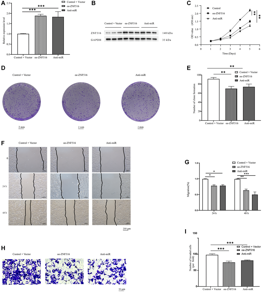 After conducting additional research, we investigated the molecular mechanism that ZNF516 uses to control the behavior of trophoblast cells. Initially, we used RT-qPCR and Western blotting to look at ZNF516 expression in HTR-8/SVneo cells treated with either oe-ZNF516 or anti-miR. There was a significant increase in ZNF516 expression in trophoblasts in the oe-ZNF516 and anti-miR groups compared to the control + vector group (P < 0.001, Figure 4A, 4B). Then, we examined the proliferation of trophoblasts transfected with either oe-ZNF516 or anti-miR using CCK-8 assays. ZNF516 overexpression reduced the trophoblast proliferation rate (P < 0.01, Figure 4C). The results of the colony formation experiments demonstrated a significant inhibition of trophoblast colony formation upon overexpression of ZNF516 (P < 0.01, Figure 4D, 4E). Furthermore, it was observed by wound healing assays that the migration capacity of HTR 8/SVneo cells was diminished upon overexpression of ZNF516 (P < 0.05, Figure 4F, 4G); this finding is consistent with the findings of the Transwell assays, which also revealed that ZNF516 overexpression significantly slowed trophoblast invasion (P < 0.001, Figure 4H, 4I). Collectively, our findings indicate that ZNF516 hinders the viability, proliferating, and invasion of HTR 8/SVneo cells.
