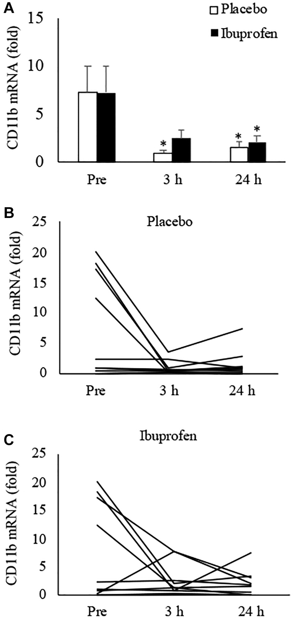 We recently reported a significant decrease in p16INK4a mRNA levels in the human skeletal muscle of young men, 24 h after HIIE [15]. This senolytic outcome occurred after a significant immune cell infiltration (i.e., CD11b+ cells) in muscle tissues immediately post-exercise with elevation in γ-H2AX signals. However, no cell infiltration and senolytic outcomes were observed after moderate-intensity exercise with a similar cycling workload (~70 kJ). These findings suggest that inflammation, typically observed with a higher magnitude of muscle damage, may be necessary to trigger the senolytic effect of exercise in human skeletal muscle. Furthermore, it remains unclear whether the senolytic response can occur as early as within 3 h after high-intensity exercise. The present study was designed to investigate the causality between exercise-induced senolytic effects and inflammation using ibuprofen, a widely used anti-inflammatory drug. While demonstrating efficacy in alleviating pain, the maximum over-the-counter doses of ibuprofen can hinder both strength and muscle hypertrophic adaptations during an exercise training period in young adults [16]. Here we examined the time course of changes in p16INK4a mRNA and pro-inflammatory myeloid differentiation (CD11b mRNA) in human skeletal muscle at 3 h and 24 h following HIIE under ibuprofen-treated and placebo-treated conditions.