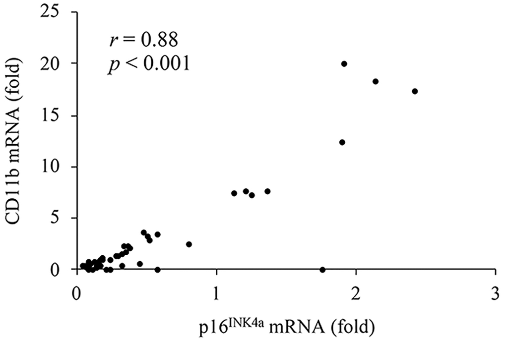 In this study, a very high correlation between p16INK4a mRNA and CD11b mRNA in skeletal muscle, offering compelling in vivo human evidence to support this concept. The results also affirm a prior discovery [28], highlighting a significant correlation between the muscle cellular senescence marker p16INK4a mRNA and Myeloperoxidase (MPO) mRNA in human skeletal muscle. MPO, highly expressed in phagocytes, indicates reduced inflammation levels following the clearance of senescent cells after high-intensity exercise.
