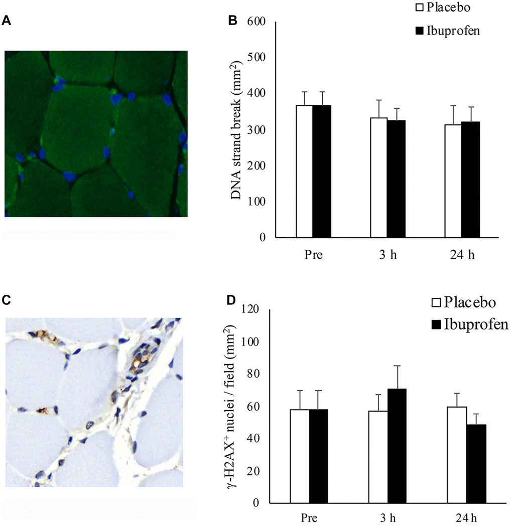 Figure 4 illustrates the results of DNA strand break (TUNEL-positive nuclei/mm2) and DNA repair markers (γ-H2AX-positive foci/mm2) in human skeletal muscle after HIIE. Representative immunofluorescence staining of TUNEL-positive nuclei in biopsied muscle is shown in Figure 4A. Decreases in DNA strand break levels after HIIE from pre-exercise baseline to 3 h and 24 h was small and not statistically significant (Figure 4B). A representative immunohistochemical staining image of γ-H2AX positive foci is shown in Figure 4C. γ-H2AX levels at 3 h and 24 h after HIIE were not significantly different from pre-exercise baseline (Figure 4D).