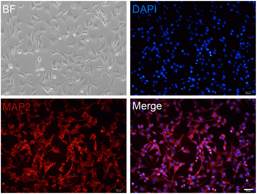 To obtain high purity and healthy neurons for screening the effective concentration of mangiferin, we examined cultured cells using MAP2 antibody staining. The images in Figure 1 showed almost all the cells were labeled with MAP2 (Figure 1), indicating the high purity of the hippocampal neurons.