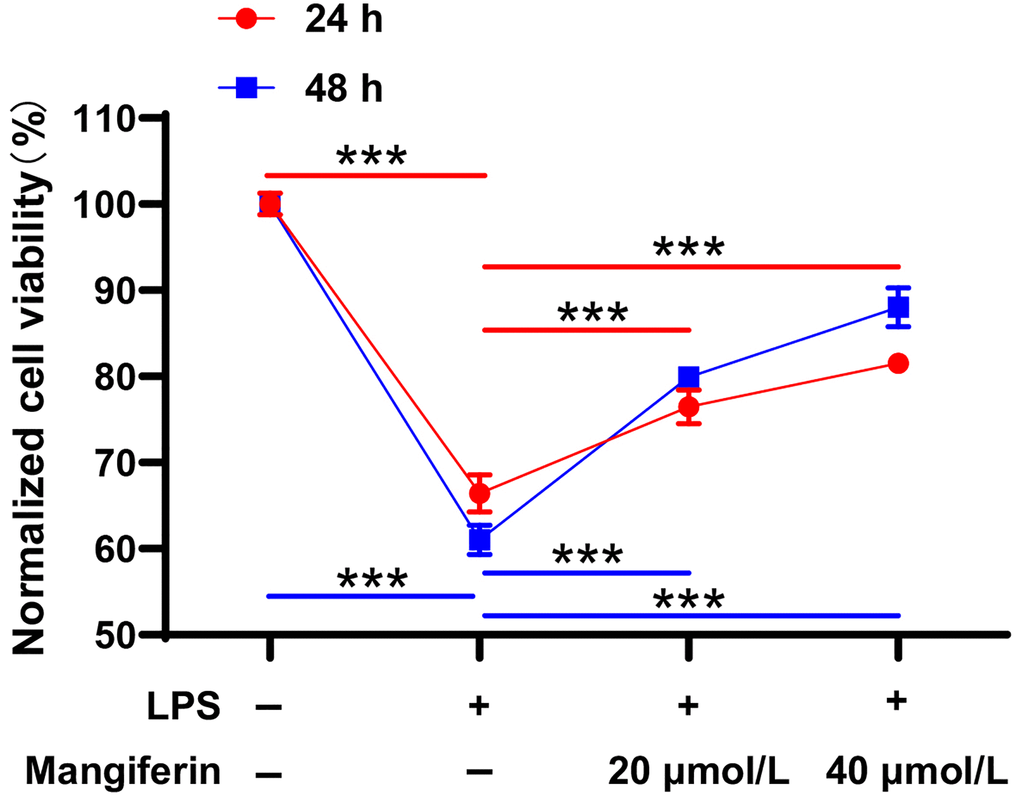 Lipopolysaccharides (LPS), components of the outer membrane of Gram-negative bacteria, are key activators of immune responses during SAE [16]. To test the protective effectiveness of mangiferin, we used 20 μmol/L and 40 μmol/L of mangiferin to counteract neuron injuries induced by 1 μg/mL LPS. With 24 h or 48 h of mangiferin incubation, the CCK-8 assay data showed that LPS significantly damaged cell viability (Figure 3, 66.41% in 24 h, 61.07% in 48 h, ***P < 0.001 compared to the PBS control group); however, mangiferin reversed damage at 20 μmol/L (Figure 3, 76.50% in 24 h, 79.91% in 48 h, ***P < 0.001) and 40 μmol/L (Figure 3, 81.54% in 24 h, 88.02% in 48 h, ***P < 0.001). These data strongly supported the idea that 20 μmol/L or 40 μmol/L mangiferin protected neurons from LPS injury.
