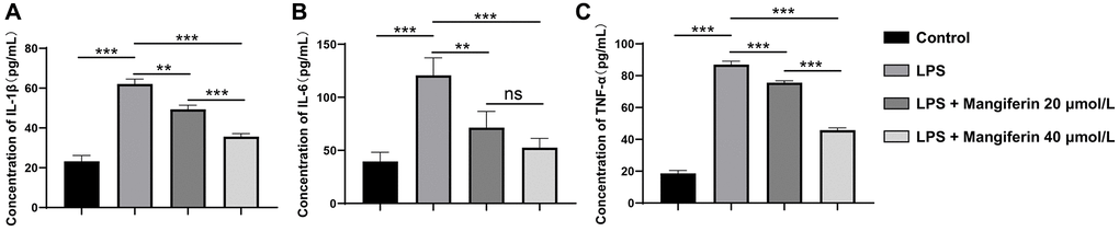 The neurons were exposed to 1 μg/mL LPS and then incubated with 20 μmol/L or 40 μmol/L mangiferin for 48 h. The supernatants were collected and the concentration of IL-1β, IL-6, and TNF-α was measured by ELISA assay according to the manufacturer’s protocol.