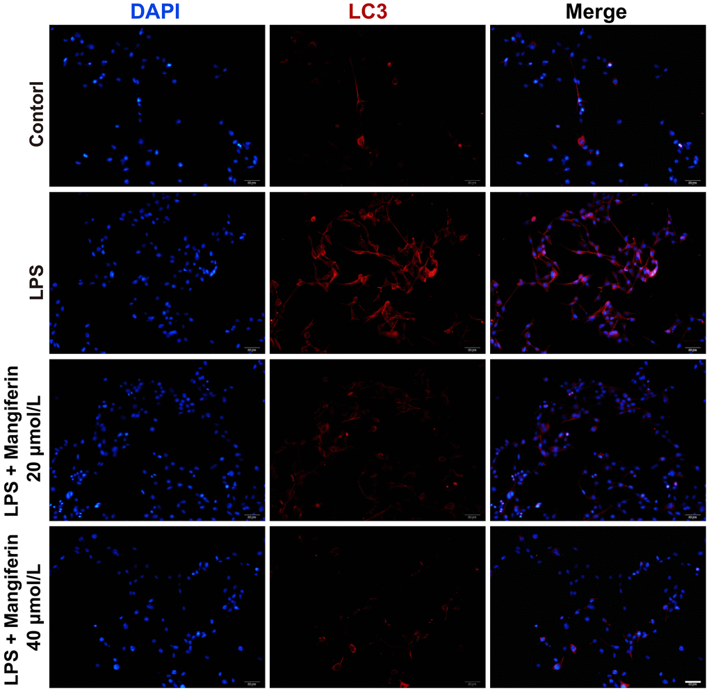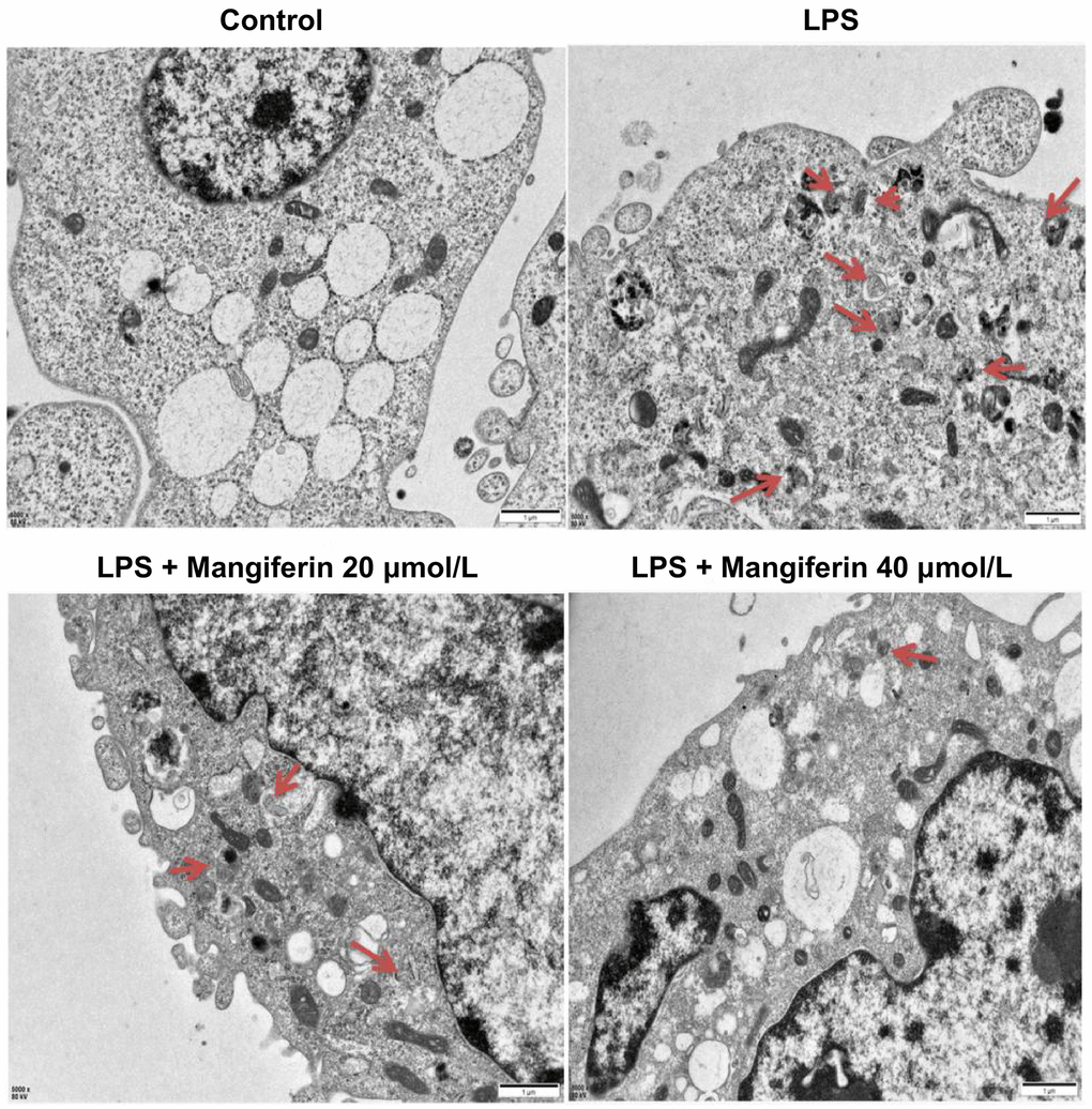 Apoptosis is always accompanied by autophagy, and LC3 is a widely accepted molecular marker of autophagy activation. To verify the role that mangiferin played during autophagy, we examined LC3 expression after 48 h of 20 μmol/L or 40 μmol/L of mangiferin treatment on LPS-exposed neurons by immunofluorescence. Both LC3 positive cells and the fluorescence intensity of LC3 increased substantially (Figure 5), and 20 μmol/L and 40 μmol/L of mangiferin reversed these phenotypes, indicating that mangiferin inhibited the LPS-induced autophagy process. To directly examine the anti-autophagic effect of mangiferin, we used a transmission electron microscope (TEM) to examine the ultrastructure of autophagosomes. Autophagosomes usually have a vacuolar-like structure of bilayer or multilayer membranes that contain cytoplasmic components such as mitochondria, endoplasmic reticulum, and ribosomes [17]. Consistent with the data of LC3 fluorescence, the number of autophagosomes increased markedly in the LPS group, while 20 μmol/L or 40 μmol/L of mangiferin alleviated the number of autophagosomes (Figure 6). These data demonstrate the anti-autophagic effect of mangiferin.