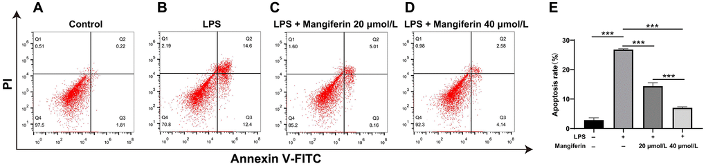 Autophagy is normally protective of cell survival, but excess autophagy leads to apoptosis [18]. To assess the anti-apoptotic effect of mangiferin, we detected cell apoptosis after 48 h of 20 μmol/L or 40 μmol/L of mangiferin treatment on LPS-exposed neurons by flow cytometry. As shown in Figure 7, LPS exposure significantly increased the apoptosis rate of neurons (Figure 7A, 7B), while 20 μmol/L and 40 μmol/L of mangiferin reversed LPS-induced neurons apoptosis (Figure 7C, 7D, one-way ANOVA, F = 636.8, ***P < 0.001), showing an anti-apoptotic effect of mangiferin (Figure 7E).