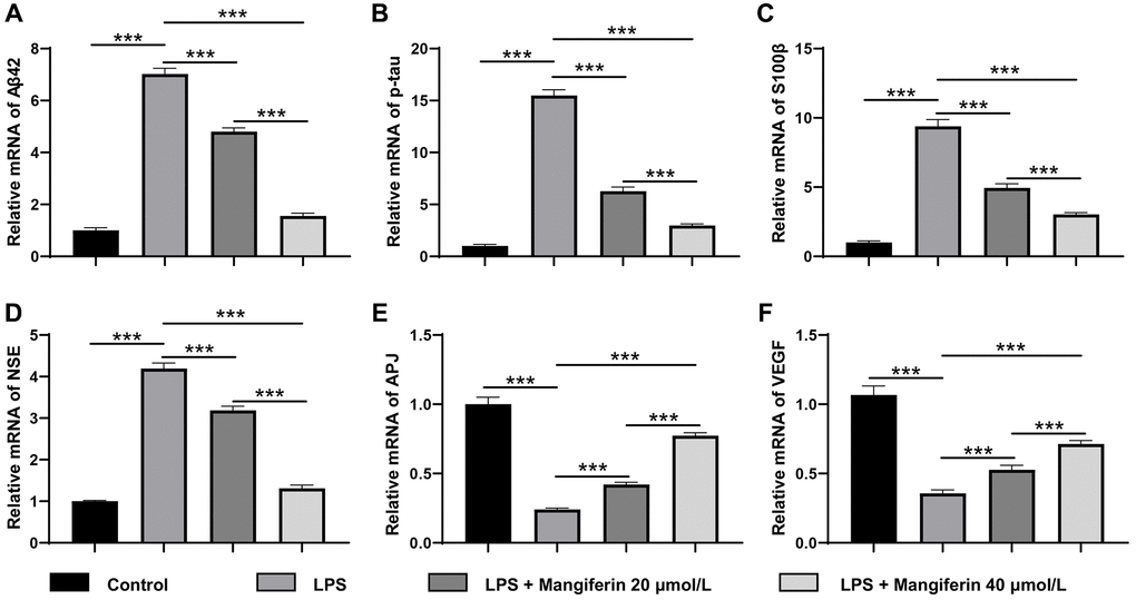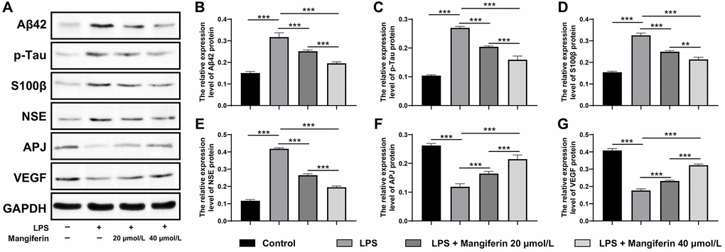 All drugs, kits, and antibodies used in this study were purchased as listed: mangiferin, Solarbio, China, IM0030; CCK-8 kit, Solarbio, CA1210; IL-1β ELISA kit, Multisciences, China, EK201B; IL-6 ELISA kit, Multisciences, EK2153; TNFα ELISA kit, Multisciences, EK282; Annexin V-FITC/PI kit, BioSharp, China, BL110A; anti-LC3, Proteintech, China, 14600-1-AP; anti-Aβ42, Bioss, USA, BS0107R; Anti-p-Tau, Affinity, USA, AF3148; Anti-APJ, Affinity, DF13350; Anti-VEGF, Affinity, AF5131; Anti-S100β, Affinity, DF6116; Anti-NSE, Affinity, AF5473.
