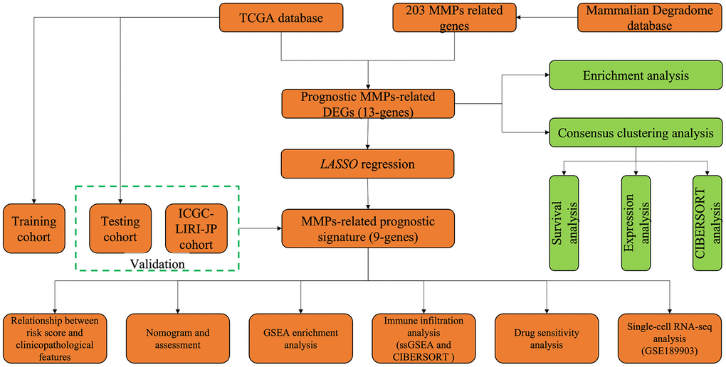 The database Mammalian Degradome (http://degradome.uniovi.es/dindex.html) was used to look for MMPs-related genes. RNA sequencing profiles and patient information for 374 HCC samples were downloaded from The Cancer Genome Atlas (TCGA) database (https://portal.gdc.cancer.gov/). In addition, 231 HCC patients from the International Cancer Genome Consortium for the Study of Liver Cancer in Japan (ICGC-LIRI-JP) dataset and their corresponding clinical characteristics were obtained from the ICGC database (https://dcc.icgc.org/). Furthermore, a single-cell sequencing set of HCC (GSE189903) was downloaded from the GEO database (https://www.ncbi.nlm.nih.gov/geo/). The acquisition of all publicly available data adheres to the publication and database access policies for the mentioned databases. A flowchart for bioinformatics analysis of publicly available datasets from the TCGA, ICGC, and GEO databases is shown in Figure 1.