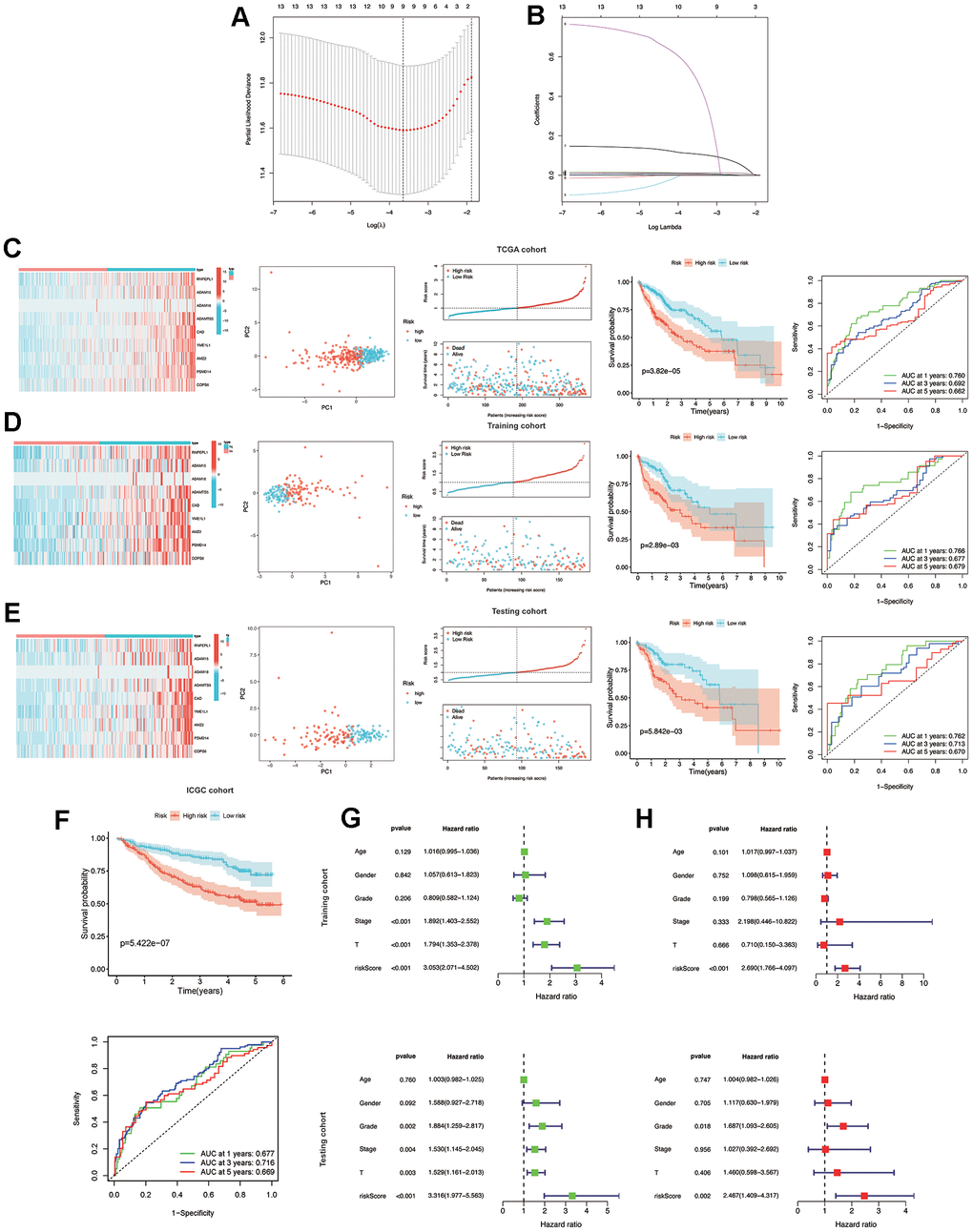 The outcome was anticipated and validated through the use of multivariate Cox regression analysis, which additionally demonstrated the use of the risk model to be an independent prognostic factor for HCC patients in both the training cohort (P<0.001, HR=2.690, 95% CI: 1.766-4.097) and the testing cohort (P=0.002, HR=2.467, 95% CI: 1.409-4.317), irrespective of other clinical factors (Figure 4H).