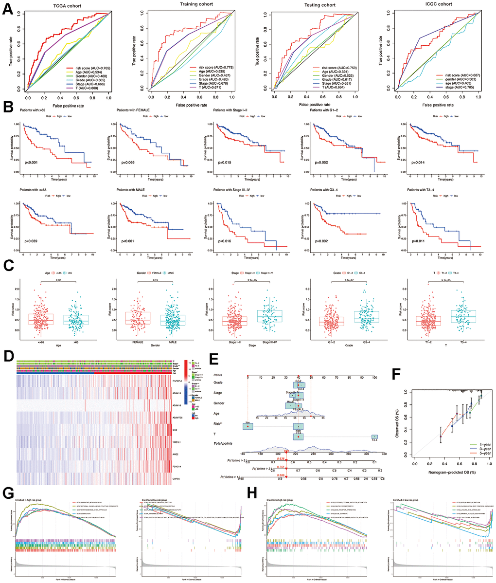 To further demonstrate the importance of the prognostic signature associated with MMPs, the ROC results indicate that risk scores can achieve a tremendous overall advantage compared to clinicopathological features in both the TCGA-LIHC and ICGC-LIRI-JP cohorts. The analysis involved examining the correlation between clinicopathological features and risk scores (Figure 5A). In the TCGA group, the risk scores were found to be associated with the T stage and tumor stage (P<0.001), whereas no association was found with age, sex, and grade (P>0.05) (Figure 5B). Furthermore, the associated risk score increases as the tumor stage rises (Figure 5C). The heatmap displays the variation in the expression of the prognostic signature related to MMPs across different clinical characteristics and risk categories within the TCGA-LIHC cohort (Figure 5D). Combining five prognostic factors generated a nomogram to predict the OS at 1-, 3-, and 5-year using the TCGA-LIHC data (Figure 5E). The calibration curves for the prediction of OS at 1-, 3-, and 5-year are in good agreement with the observed values (Figure 5F).