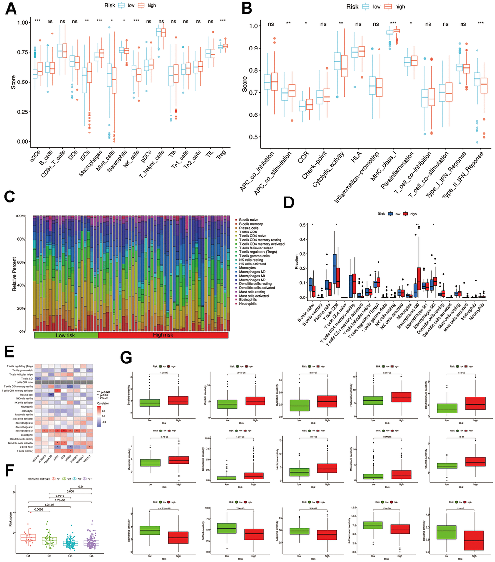 According to the analysis of ssGSEA, it was found that the group at high risk showed increased levels of expression for four immune cells, specifically aDCs, iDCs, macrophages, and Treg. The low-risk showed increased levels of three immune cells: mast cells, neutrophils, and NK cells (Figure 6A). Moreover, the high-risk group exhibited enhanced functionality of immune cells, such as APC co-stimulation, CCR, Parainflammation, and MHC class I, compared to the low-risk group (Figure 6B). Using CIBERSORT analysis, 22 immune cell profiles were detected in the low and high-risk groups. The results showed that the high-risk group had a higher percentage of M0 and M2 macrophages, while the low-risk group had larger CD8 T and naive B cells (Figure 6C, 6D). Spearman correlation analysis revealed a significant positive correlation between 9 MMPs-related prognostic genes and CD4 memory-activated T cells and M0 macrophages (Figure 6E).