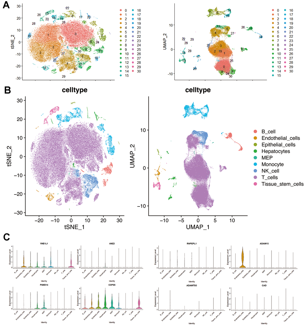 Seurat was employed for dimensionality reduction (Supplementary Figure 2) and clustering of the single-cell data, while SingleR was employed for cell-type annotation (Figure 7A, 7B). In the single-cell dataset, the expression of 8 genes belonging to the MMPs-related prognostic signature was identified. These genes include YME1L1, AMZ2, RNPEPL1, ADAM15, PSMD14, COPS6, ADAMTS5, and CAD. Among these genes, YME1L1 and ADAM15 were predominantly expressed in clusters of endothelial cells, while AMZ2, PSMD14, and COPS6 were predominantly expressed in clusters of hepatocytes. Additionally, YME1L1 and COPS6 were the main genes expressed in clusters of monocytes (Figure 7C, 7D).