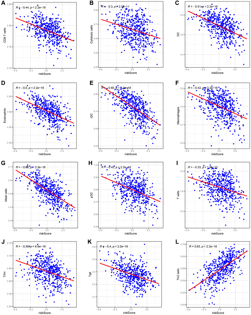 Given the prominence of immune pathways in GSEA, a differential examination of immune cell infiltration across risk factions was inaugurated. Findings intimated that the relative score of NK CD56dim cells and Th2 cells increased in the high-risk group, whereas metrics of an array of cells like B cells, Eosinophils, CD8 T cells, and Neutrophils dominated in the low-risk group (Figure 9A, 9B). These results suggest that the immunological milieu of individuals in the high-risk group is inhibited, which may be a factor in the prognosis’s bad outcome. A Pearson correlation was also deduced between the risk metric and various immune-related cells. The ensuing data indicated an inverse correlation between risk score and cells like CD8 T cells, Cytotoxic cells, DC, Eosinophils, iDC, Macrophages, Mast cells, pDC, T cells, TFH, and Tgd (Figure 10A–10K). Meanwhile, Th2 cells exhibited a symbiotic relationship with the risk score (Figure 10L).