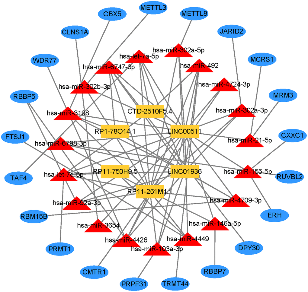 To further explore the ceRNA regulation mechanism based on six prognostic lncRNAs, we attempted to construct a lncRNA-miRNA-mRNA regulatory network. Combining the prediction result of the public database with lncRNAs related-methyltransferase, we finally created a regulatory network containing 6 prognostic lncRNAs, 19 miRNAs, and 21 mRNAs (Figure 11, Supplementary Table 7).