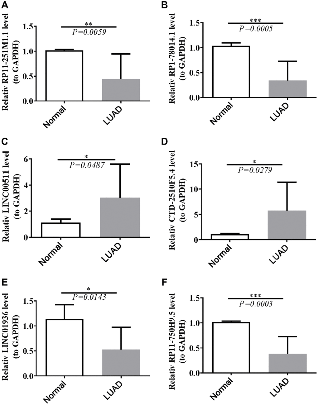 Data from the TCGA database showed that LINC00511 and CTD-2510F5.4 were up-regulated, as seen in Supplementary Table 3. Down-regulated in LUAD samples were RP11-251M1.1, RP1-78014.1, LINC01936, and RP11-750H9.5. Ten normal and ten LUAD samples were gathered, the RNA was extracted, and RT-qPCR was carried out aand the results further confirmed the findings. RP11-251M1.1, RP1-78014.1, LINC01936, and RP11-750H9.5 were down-regulated, as can be shown in Figure 12. When compared to normal samples, LINC00511 and CTD-2510F5.4 were more highly expressed in LUAD samples. In conclusion, the RT-qPCR results were in line with the information in the public database.