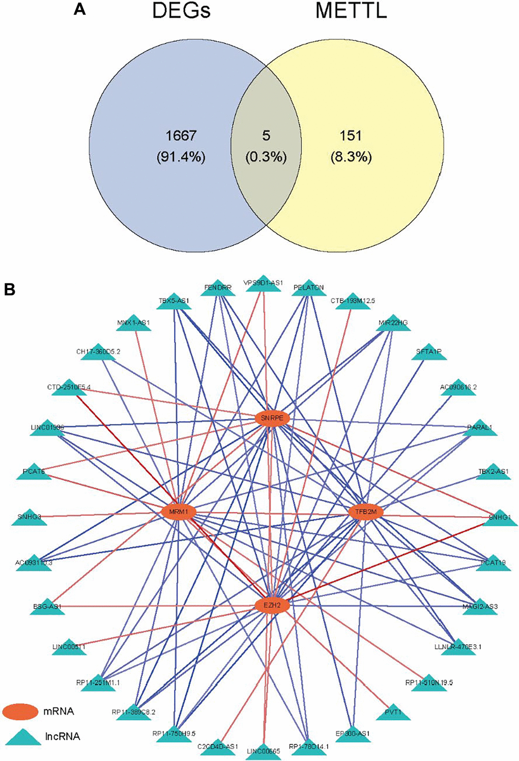 We first used Miranda to predict the miRNAs targeted by the prognostic lncRNAs and then used Starbase to predict the mRNAs targeted by the miRNAs. Using Cytoscape software, combined with methyltransferase-related genes, a lncRNA-miRNA-mRNA regulatory network was created.