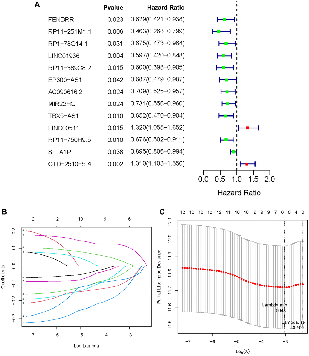 A training set of 338 specimens and a testing set of 145 individuals were created from the 483 LUAD patients in the TCGA cohort. After that, 32 MeRlncRNAs from the training cohort were used in the univariate Cox regression analysis to find out the lncRNAs associated with prognosis. In the training set, the OS of cancer patients was shown to be strongly correlated with 13 out of the 32 MeRlncRNAs. (Figure 3A). Then, the 13 lncRNAs were further submitted to LASSO regression analysis. Six MeRlncRNAs (RP11-251M1.1, RP1-78014.1, LINC01936, LINC00511, RP11-750H9.5, and CTD-2510F5.4) were identified as prognostic lncRNAs (Figure 3B) with lambda.min was 0.048 (Figure 3C). Details such as regression coefficient can be found in the Supplementary Table (Supplementary Table 5). The model was constructed by the formula: Riskscore = −0.081695395 × RP11-251M1.1 + −0.022561732 × RP1-78014.1 + −0.071522442 × LINC01936 + 0.012186292 × LINC00511 + −0.10909988 × RP11-750H9.5 + 0.105977347 × CTD-2510F5.4.