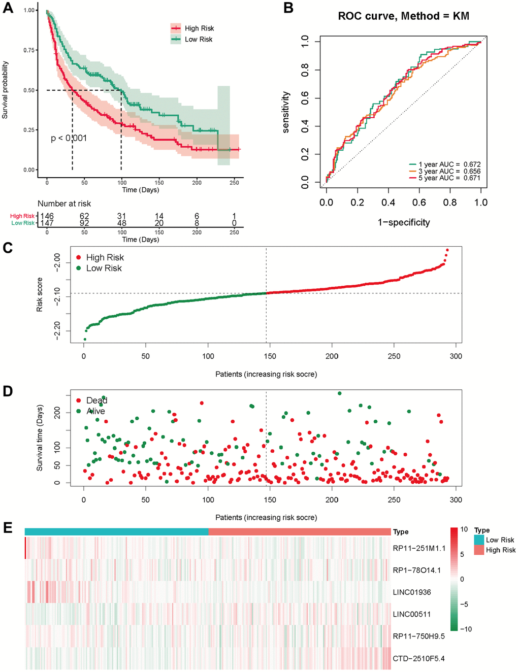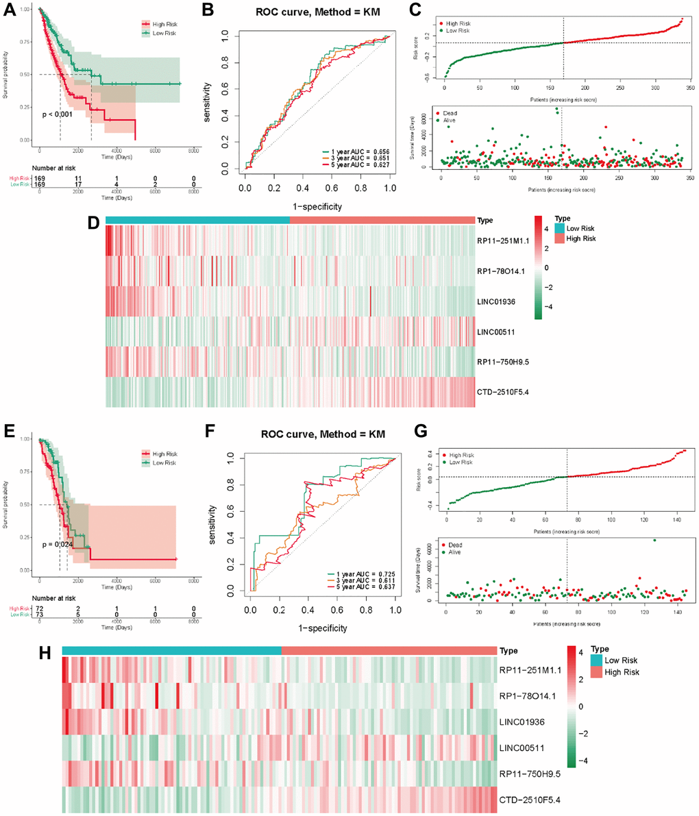 In the TCGA-LUAD cohort, the training group was divided into a low-risk group and a high-risk group, using the median as the dividing criterion. High-risk patients have worse prognosis than low-risk patients (Figure 4A). In the training set, the AUC values for 1, 3 and 5 years were 0.656, 0.651, and 0.627, respectively (Figure 4B). Figure 4C visually demonstrates the risk score and survival status in the training cohorts. The survival status distribution plot shows that as the risk score increases, patients face a greater risk of death. Figure 4D shows the expression of six prognostic lncRNAs. Transcription analysis results showed that the expression of LINC00511 and CTD-2510F5.4 was up-regulated in the high-risk group, while the expression of RP11-251M1.1, RP1-78014.1, LINC01936 and RP11 750H9.5 was up-regulated in the low-risk group. At the same time, the test group also showed similar results to the training group (Figure 4E–4H).